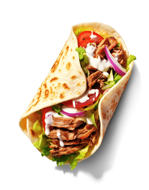 Wheat tortilla with spicy chicken bites, cheese sauce, tomatoes and soft cheese